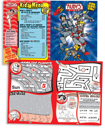 Interior of a Sci Fi themed activity book for Ruby's Diner. Comics and Illustrations were penciled, inked and then colored in Photoshop. Game elements, graphics and final layout was done in Freehand. Full Image