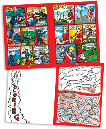 Interior of a Sci Fi themed activity book for Ruby's Diner. Comics and Illustrations were penciled, inked and then colored in Photoshop. Game elements, graphics and final layout was done in Freehand.