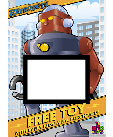 Retrobots Point of Purchase. (The black/white rectangle was meant to have premium pictures that they could swap out.) Illustrated in Freehand.