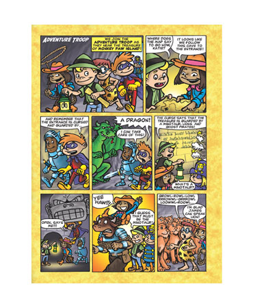 Adventure Troop interior page comic. Penciled, inked and then colored in Photoshop. Final layout was done in Freehand.